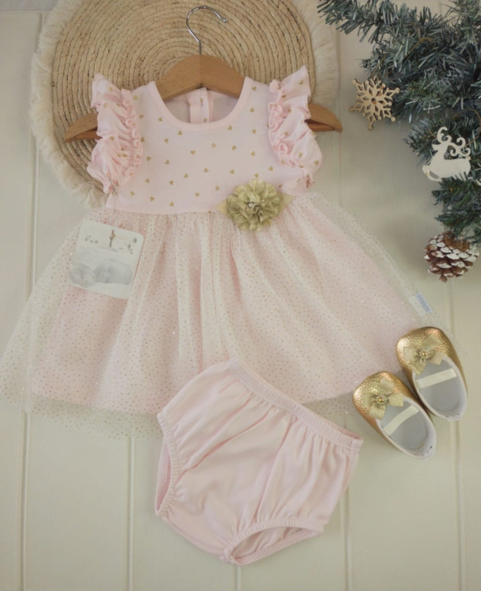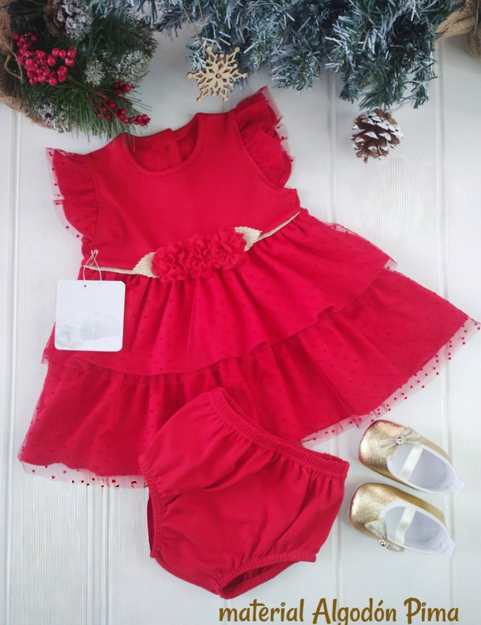 Hermoso vestido elaborado en 💯 algodón pima hipoalergénico considerado como el mejor algodón del mundo por sus múltiples cualidades y máxima suavidad. Con delicado tuti en tul y detalles en mangas, calzón y zapatos.